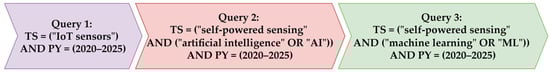The search strategy is based on the combinations of key terms presented in Figure 2. These terms were extracted by the authors of this paper from the specialized literature and included in the queries performed in WoS. These terms were combined using the logical operators AND and OR to generate detailed searches in the specialized literature regarding self-powered sensors. The authors opted for the WoS database because it has a broad coverage of indexed sources and offers the possibility of extracting metadata for bibliometric analysis. Methodological limitations include the following: