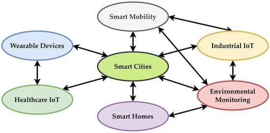 For a rigorous analysis of the specialized literature, WoS searches were conducted for 2020–2025, searching for all review articles focusing on IoT sensors. From the analysis of the specialized literature, seven reference domains were identified in which IoT sensors are used. The seven domains are smart cities, wearable devices, industrial IoT, smart homes, environmental monitoring, healthcare IoT, and smart mobility.