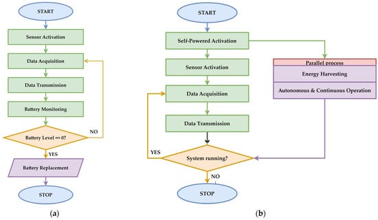Operational flow of: (a) battery-powered IoT sensor process; (b) self-powered IoT sensor process.
