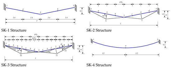 In terms of structural arrangement, tensegrity structures [] are structurally similar to the suspension systems discussed in this article. In tensegrity structures, the bars are subjected to compressive forces, while the cables carry tensile forces. However, under external compressive loads, the overall stability of the structural system becomes a critical issue for tensegrity structures [,]. It is important to note that in the suspension systems considered here, which are composed of rigid elements and subjected to uniformly distributed external loads applied to the upper chord, tensile forces or a combination of tensile and bending forces occur, except in the struts. Therefore, for these suspension structures, the problem of overall stability can be addressed by applying appropriate structural constraints.