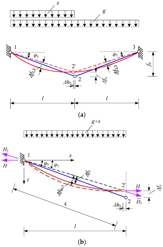 Calculations of all suspension structures consisting of elements “1–2” and “2–3” are performed in the iteration procedure. Asymmetric loading increases the complexity and sensitivity of structural calculations. The main unknowns of the iterative calculation are ∆f_(fic,1), ∆f_(fic,2), ∆f_c, ∆h_c, and H_1 and H_2. Obviously, the iterative calculation process becomes more complicated than in the case of symmetrical loading [].
