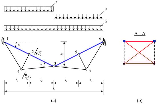 The upper chord, which has a bending stiffness (EI ≠ 0), is load-bearing, and the lower chord is stabilizing (see Figure 3). This chord is most often designed from flexible bar elements (EI → 0). It is also necessary to note that the “rigid” elements of the upper chord (“1–2”, “2–3” and “3–5”, “5–6”) are hinged and connected to each other (see Figure 3).
