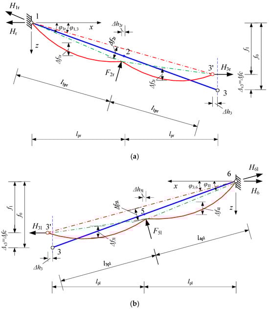 Deformed scheme of the left (a) and right (b) side of the upper chord element of the asymmetrically loaded cable–strut system.