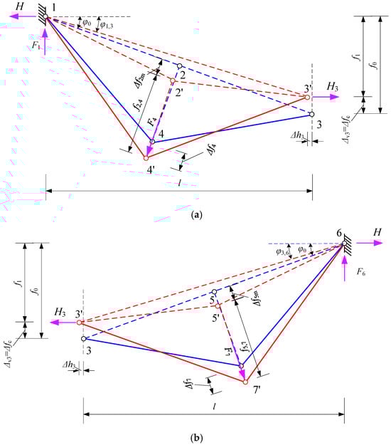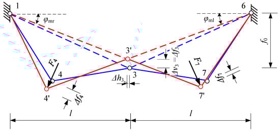 In an asymmetrical loading of the system, the elements of the lower chord will deform as shown in Figure 5. The node “3” (central hinge) will shift not only vertically by the value but also horizontally by the value towards the side of the structure loaded with the asymmetric load. In this case, the displacement of nodes “4” and “7” will be and . It is obvious that the forces of the struts F4 (left side) and F7 (right side) will not be equal as a result of the different loads acting on the upper chord parts (left and right).