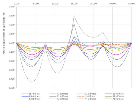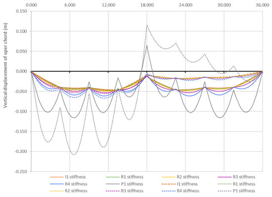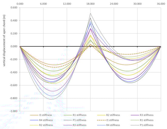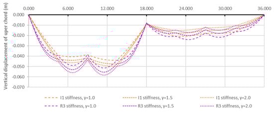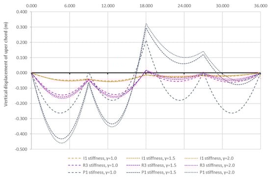 Figure 12 illustrates the influence of the load ratio γ on the displacement distribution. The numerical results for the two-level system, which are similar to those of the suspension single-level system, indicate that under asymmetric loading, the load ratio has minimal effect if the upper chord has sufficient stiffness (I1–R4). Only at very low bending stiffness (P1) does the load ratio significantly impact the displacements.
