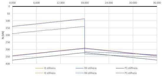 The distribution of axial forces under asymmetric and symmetric loads is shown in Figure 13. The results reveal that the axial forces are nearly identical when the upper chord stiffness ranges from I1 to R4. Therefore, Figure 13 shows the results only when the stiffnesses are I1, R4, and P1. However, with very low bending stiffness, the axial forces increase with the largest differences reaching 9.0% (31.0 kN) under symmetric loading and 37.8% (52.1 kN) under asymmetric loading. Notably, under asymmetric loading, the axial forces are greater than under symmetric loading only on the less loaded side of the structure, closer to the central point “5”. Therefore, it can be concluded that asymmetric loading does not significantly influence axial forces compared with symmetric loading.
