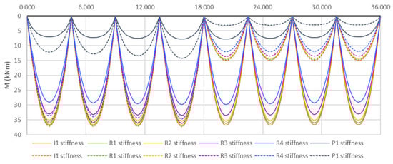 Figure 14 shows the distribution of bending moments in the upper chord under asymmetric and symmetric loads. It should be noted that these bending moments are considerably lower than those observed in the single-level system. Additionally, the magnitude of bending moments strongly depends on the bending stiffness of the upper chord. For instance, under asymmetric loading, the bending moment values for I1 and P1 stiffnesses differ by up to 3.05 times, and under symmetric loading, by up to 5.19 times.