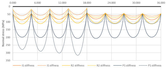 It may seem that the most efficient design for minimizing bending moments occurs when the upper chord has a low bending stiffness (P1). However, a more accurate assessment of the suspended system’s efficiency, particularly with a stiff upper bending chord, can be made by comparing the normal stresses of the upper chord cross-section. These stresses are calculated by combining the effects of axial forces and bending moments for various bending stiffness values, as illustrated in Figure 15. It is important to recall that the cross-sectional areas of the examined upper chords varied only slightly. The stress graphs in Figure 15 reveal that the most efficient cross-sections correspond to the highest stiffness values, where the maximum stress is σ = 86.9 MPa. In contrast, the lowest stiffness in the upper chord results in significantly higher stress values, reaching σ = 316.5 MPa.