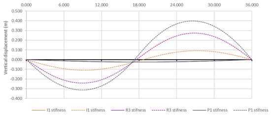 Comparing results between the single-level suspension system (SK-2) and the two straight bar suspension structure (SK-1), the displacements (see Figure 9) at points “2” and “4” in SK-2 decreased compared with points “a” and “b” in SK-1 under asymmetric loads. Specifically, the vertical displacement at point “2” decreased by a factor of 7.72 to 13.01, depending on stiffness, while at points “a” and “b” of SK-2, the displacements decreased by a factor of 1.31 to 4.84. However, at low stiffness (P1), the displacements remained relatively large (0.432 m). At higher bending stiffness levels (I1 and R1), the vertical displacements at points “a”, “2”, and “b” were similar.