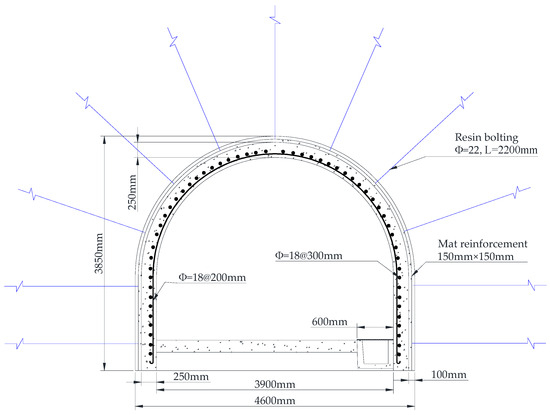 The original support scheme for the roadway is illustrated in Figure 1. This scheme employs a combination of resin bolts, steel mesh, and shotcrete for support. Specifically, the resin bolts have a diameter of 22 mm and a length of 2200 mm, constructed from HRB400 threaded steel bars. The borehole diameter is 42 mm, with a row spacing of 1000 mm by 1000 mm, arranged in a plum blossom pattern. The anchor bolt tray is fabricated from a Q235 steel plate, with a thickness of 10 mm and dimensions of 150 mm by 150 mm. The anchoring section of the anchor bolt features full-length anchoring. The shotcrete used has a strength classification of C20, with an initial application thickness of 50 mm, followed by an additional 50 mm for re-spraying. The allowable range for over-excavation is +150 mm.