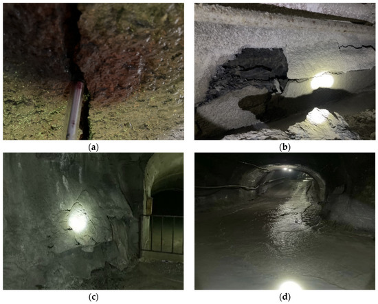 Field survey map: (a) crack and water leakage; (b) completely detached; (c) outer drum of two sides of roadway; (d) tunnel water.