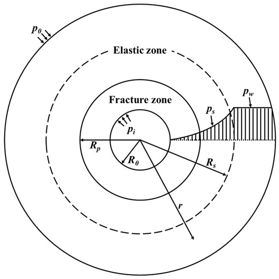 Before analyzing the elastic–plastic distribution of the surrounding rock in a roadway influenced by pore water pressure, the following assumptions must be established: (1) the roadway excavation creates both a broken zone and an elastic zone; (2) the roadway is located at a depth greater than 20 times its radius; (3) the surrounding rock is considered an isotropic, homogeneous medium, with the original rock stress being equal in all directions; (4) the roadway cross-section is circular, its length is infinite, the properties of the surrounding rock are uniform, and the problem can be treated as a plane strain scenario; (5) groundwater flow adheres to Darcy’s law; (6) the seepage volume force in the mechanical model is represented by pore water pressure.