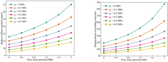 In order to find out the degree of influence of pore water pressure on the fracture zone of the surrounding rock under different supporting conditions, pore water pressures of 0 MPa, 0.4 MPa, 0.8 MPa, 1.2 MPa, 1.6 MPa, and 2 MPa were applied. The resulting influence curves depicting the influence of different water pressures and the radius and displacement of the fracture zone in the surrounding rock under different supporting conditions are drawn (Figure 4). It can be observed from the figure that as water pressure increases, both the radius and displacement of the crushing zone gradually expand. The main reason for this phenomenon is that following the excavation and unloading of the surrounding rock, the seepage water within the pores and fissures of the rock mass dissipates significantly to the free surface. At this point, the reduction in water pressure diminishes the degree of cementation between the rock mass structures. Concurrently, the two-way effective stress acting on the surrounding rock mass gradually increases, thereby accelerating the failure process of the rock mass structure. As the rate of water pressure dissipation increases, this effect becomes even more pronounced. Consequently, the surrounding rock mass becomes more susceptible to yield failure, ultimately resulting in the observation that higher water pressure correlates with a larger radius and displacement of the fracture zone following excavation and unloading. For example, when the supporting force pi = 0.3 MPa, the radius of the surrounding rock fracture zone with a pore water pressure of 0 MPa is 10.29 m, and the displacement of the fracture zone is 89.32 mm. In contrast, the radius of the surrounding rock fracture zone with a pore water pressure of 2 MPa is 14.25 m, and the displacement of the fracture zone is 183.26 mm. The radius and displacement of the broken zone are increased by 1.38 times and 2.05 times, respectively, compared to the previous measurements. This demonstrates that pore water pressure significantly influences both the radius and displacement of the broken zone.