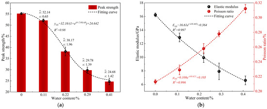 Strength characteristics of rock specimens under different water content: (a) peak strength; (b) elastic modulus and Poisson’s ratio.