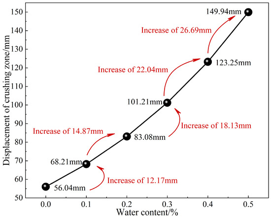Using MATLAB (MATLAB 2014a) to analyze Equation (17), the relationship curve between different water content and the displacement of the crushing zone can be obtained, as shown in Figure 7. It is not difficult to see from the figure that with the increase in water content, the displacement of the broken zone shows an increasing trend. That is to say, the higher the water content, the greater the displacement increment of the broken zone. Therefore, groundwater is highly destructive to the surrounding rock of the roadway, which also verifies the deterioration of water to the surrounding rock.