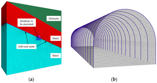 According to the geological summary and engineering situation described above, and because the target area of the simulated roadway is the water-bearing section, it is assumed that the rock mass of the whole model is water-saturated before the simulated excavation of the roadway. According to the elevation data of the groundwater level in the area provided by the field technicians, the pore water pressure at the roadway section is about 1.2 MPa, and then the hydrostatic pressure value is assigned to the numerical simulation grid unit instead of the pore water pressure. The corresponding numerical model is established by using FLAC3D simulation software (FLAC3D 6.0), as shown in Figure 8a. The model size is 50 m long, 50 m wide, and 20 m deep. It is divided into 222,207 grid units and 155,734 grid nodes.