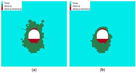 The distribution of the plastic zone caused by roadway excavation is shown in Figure 9. From the perspective of the range of the plastic zone, compared with the plastic zone of the old support scheme, the optimized support scheme has a great convergence effect on the roof and the two sides, and the bottom range is also reduced. The radius of the whole plastic zone is reduced to 4.28 m, and the volume is reduced to 1153 m3. Compared with the old support, the radius of the plastic zone is reduced by 28.9% and the volume is reduced by 49.36%. It can be clearly seen that the plastic range is well controlled after the grouting of the weak interlayer. Through the above comparison and calculation, it shows that the optimization scheme has effectively improved the stability of the surrounding rock and can control the long-term stability of the broken surrounding rock roadway.