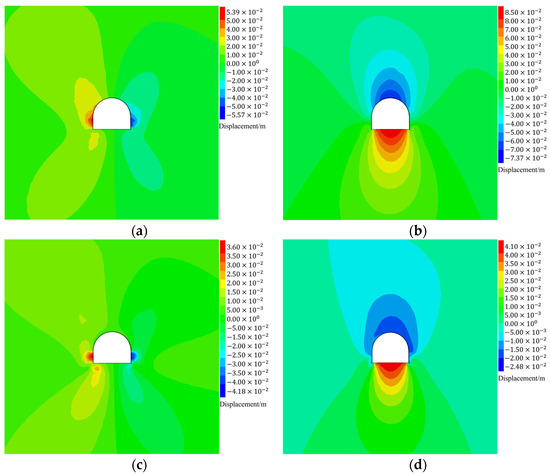 Displacement cloud diagram of surrounding rock: (a) horizontal displacement in old support; (b) vertical displacement during old support; (c) horizontal displacement after support optimization; (d) vertical displacement after support optimization.
