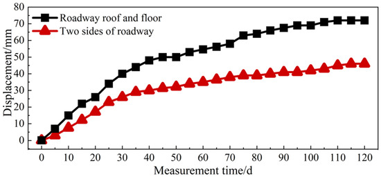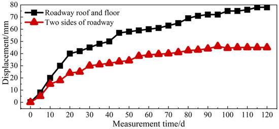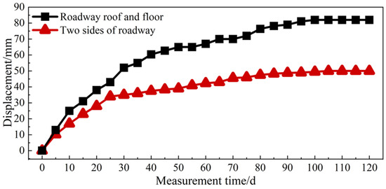 Figure 14 presents the monitoring data for Section NO. 3. The diagram indicates that the displacement of the roof and floor experienced significant changes for approximately 35 days. This displacement gradually decreased from 35 days to 80 days and stabilized thereafter. Additionally, the displacement on both sides showed considerable variation for about 25 days, after which it gradually stabilized, ultimately reaching a state of relative stability by 75 days.