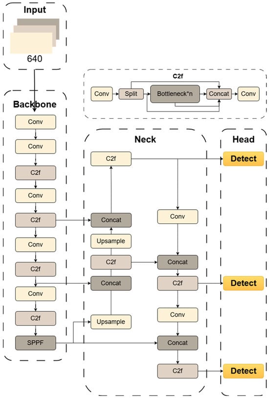 Schematic representation of the structure in YOLOv8. This figure illustrates the standard components, including the C2f modules in the backbone and neck, and the conventional Conv blocks for down-sampling.
