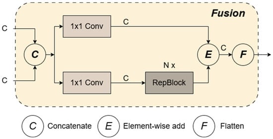 The Cross-Scale Feature Fusion Module (CCFM) was originally proposed by Baidu in RT-DETR []. This study incorporates the module back into the feature fusion component of the YOLOv8 object detection model. Before up-sampling the feature map, CCFM (as shown in Figure 3) fuses the extracted feature map through a lightweight lateral convolution operation, which uses a 1 × 1 convolution kernel to mix channels of the feature map, preparing for the channel count of subsequent layers. An additional convolutional layer is used before Concatenation to further refine features before feature fusion. The fused feature map is passed through a sequence of 1 × 1 convolutional layers utilized to enhance the feature representation capability further. The indices and processing order of the feature maps are adjusted, optimizing the feature processing workflow to adapt to different feature fusion and down-sampling operations. Compared with the traditional FPN, CCFM emphasizes inter-stage communication more. It allows features from deeper layers of the network to interact more directly with shallower features, which helps to pass richer information between feature maps of different resolutions. After a series of lightweight convolutional kernels are used, CCFM can achieve effective feature fusion with less computational cost without sacrificing detection accuracy, optimizing it for lightweight and real-time application scenarios.