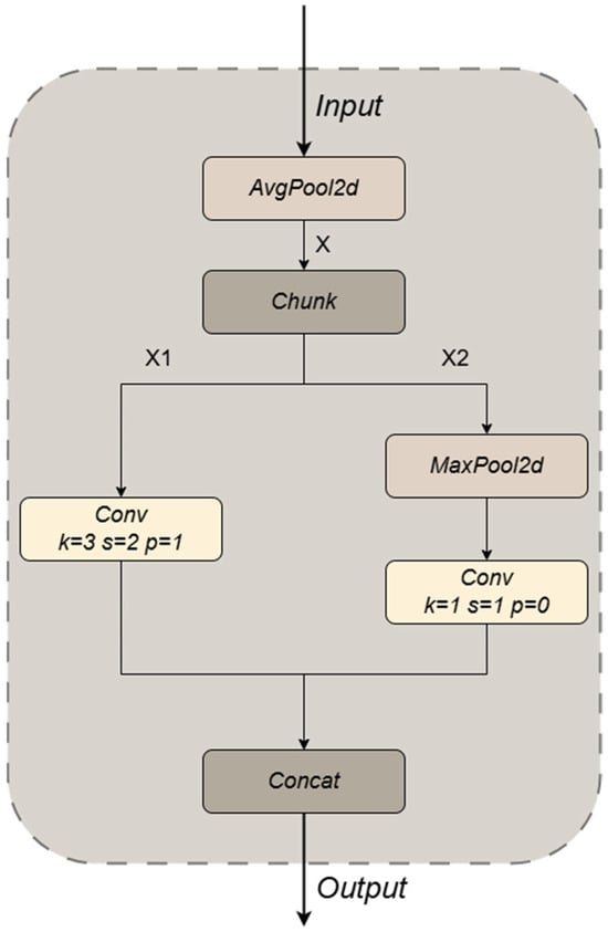 To maintain the algorithm model’s lightweight design and ensure its detection efficiency, this paper introduces the ADown module for down-sampling operations, integrated with the CCFM structure. ADown is a lightweight convolutional technique proposed by Wang et al. [] that significantly reduces the parameter count while improving accuracy. The ADown module performs down-sampling using convolution, average pooling, and max pooling. The input feature map undergoes down-sampling via an average pooling layer, which reduces its width and height using a defined kernel size and stride. After average pooling, the feature map is divided into two parts using a chunk operation, and the divided feature maps are further processed through separate convolutional layers to extract and refine features. For the second part of the feature split, it first goes through a max pooling layer for further down-sampling to enhance robustness to spatial features. The feature map obtained from max pooling is subsequently passed through a convolutional layer to refine and extract features (as shown in Figure 4). The model concatenates the processed feature maps along the channel dimension and outputs them.