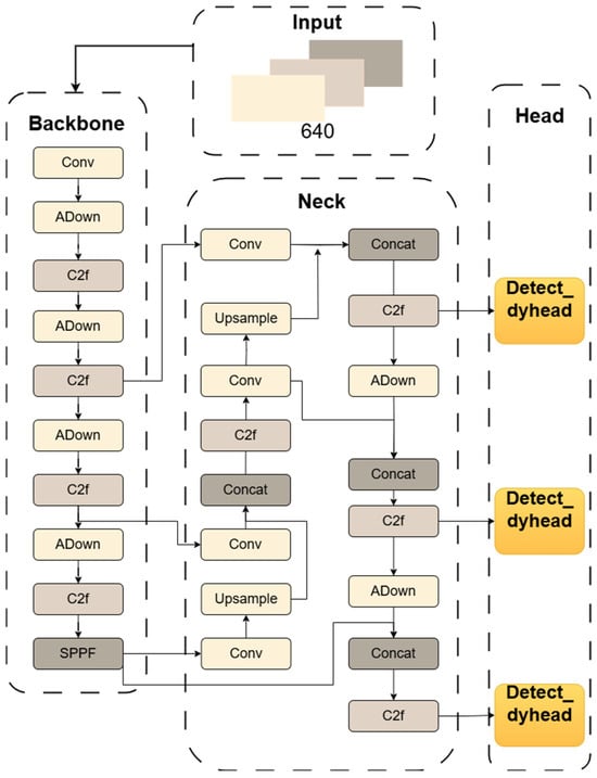 The final structure of ACD-YOLOv8 is shown in Figure 5. This figure highlights the key modifications compared to the baseline model in Figure 1, specifically the integration of the CCFM in the neck, the replacement of standard Conv down-sampling blocks with our ADown modules, and the integration of the Detect_dyhead in the detection head.