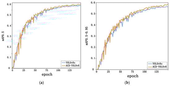 A comparison was performed to assess the mAP values of the ACD-YOLOv8 model in relation to the original model. (a) Comparison of mAP@0.5, and (b) comparison of mAP@0.5-0.95.