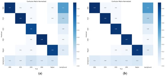 We conducted a detailed evaluation of the two models’ performance by analyzing their confusion matrices, as shown in Figure 7. The results reveal that both models demonstrate notable limitations, including high false negative rates and elevated false positive rates. Both models perform well in detecting D10 (transverse fractures) and D40 (potholes), according to a thorough investigation. At 80% and 82% accuracy rates, respectively, the initial YOLOv8s model did not do well in identifying D20 (mesh cracks) or Repair (road repairs).