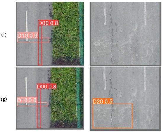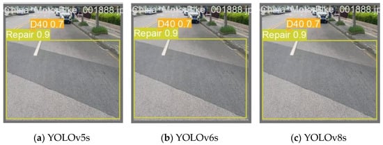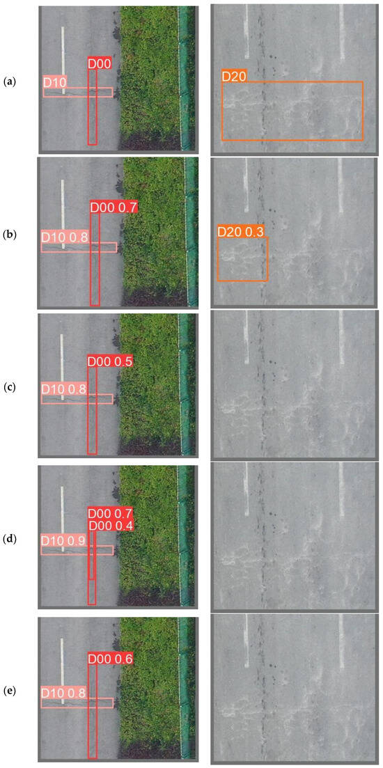This study performed comparison trials using many popular object identification algorithms to assess the improved model’s performance []. The selected models include not only the mainstream YOLO series target detectors based on CNNs, such as the earlier YOLOv5, YOLOv6 [], and YOLOv7, and the latest YOLOv9 and YOLOv10, but also multiple versions of Transformer-based target detectors, such as RT-DETR-l [] and RT-DETR-resnet50. The same dataset was used in the studies, and the same experimental setup was used. For comparison, one image from a vehicle-mounted camera and two drone-captured road condition photos from the RDD2022 dataset were chosen for identification and detection. The detection results are shown in the picture, where different defect types are indicated by annotations and different defect categories are represented by colored detection boxes. For instance, D00 denotes longitudinal cracks, D10 transverse cracks, D20 mesh cracks, D40 potholes, and Repair denotes road repairs.