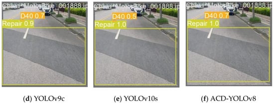 In comparison, the ACD-YOLOv8 introduced in this study achieved a notable enhancement in recognition accuracy for D20 and Repair, with improvements of 6% and 4% respectively, as shown in Figure 7.