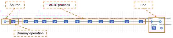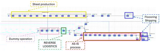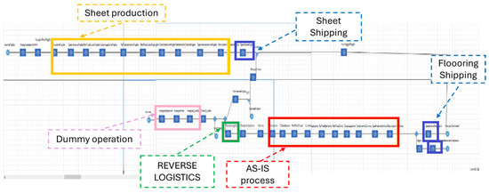 Figure 5 represents the Anylogic model, where the blocks assigning labels are highlighted in pink, the “as-is” process is highlighted in red, the production process related to the sheet is highlighted in yellow, and the shipments are highlighted in blue. Finally, the green block shows the RL phase, which is performed after the inspection phase.