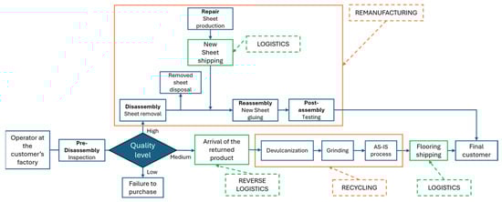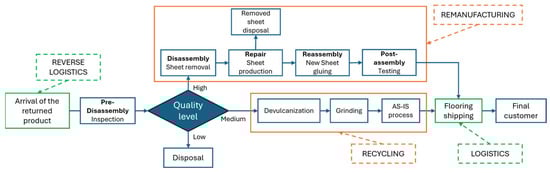 Flooring of excellent quality is processed for remanufacturing (orange ‘remanufacturing’ block), and the resulting flooring is sold on the market. Several operations, as outlined in Section 3.1.2, are performed. Afterward, the remanufactured flooring is shipped to the end user.