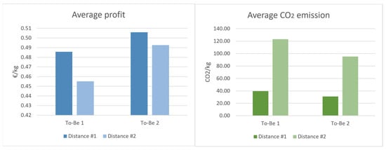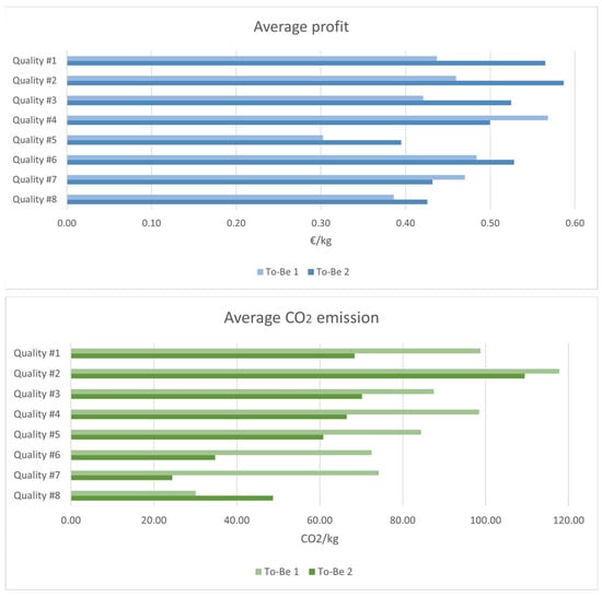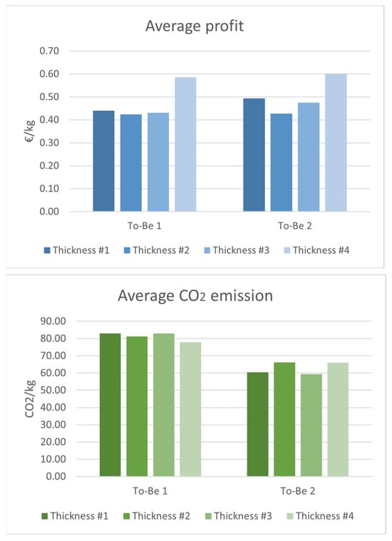 The average profit represents the mean profit per kg of flooring produced and reflects the economic efficiency of the strategy. The average CO2 emissions measure the carbon dioxide emissions per kg of flooring, providing an estimate of the environmental impact. Both KPIs are critical for identifying the most sustainable strategy.
