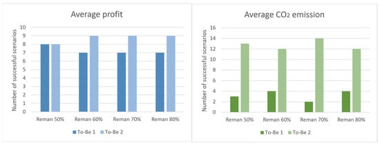 For each experiment, the simulation model provides the results for the two “to-be” scenarios. Overall, 128 different experiments were designed. Each one was replicated 25 times using a one-minute time step to simulate a typical working day. For each scenario, the average values across replications were calculated and used for the key performance indicators to ensure the consistency and robustness of the comparison of the reverse logistics strategies.