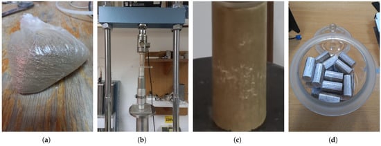 Sample preparation: (a) Soil mixture in plastic bags. (b) Triaxial load frame Tritech (model 28-WF4005, Controls S.p.A., Milan, Italy) used to compact the soil. (c) Cylindrical samples. (d) Curing in desiccator.