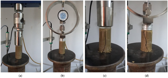 Axial load and displacement were recorded automatically via the machine’s integrated data acquisition system (Figure 2a). For specimens which exceeded the maximum axial capacity of 2.5 kN, manual proving ring and dial gauge instrumentation was employed (Figure 2b). Pre-test calibration procedures were performed to zero both the strain dial gauge and proving ring. A monotonic axial load was applied at a constant strain rate of 1.27 mm/min to evaluate the stress–strain response. Continuous monitoring of axial strain and corresponding stress values was conducted at 5 s intervals until test termination. Testing was terminated upon specimen failure (defined by visible macro-cracking or structural disintegration) or attainment of 20% vertical deformation, whichever occurred first (Figure 2c,d). Post-failure analysis included measurement of shear plane inclination relative to the horizontal plane to characterize failure mechanisms.