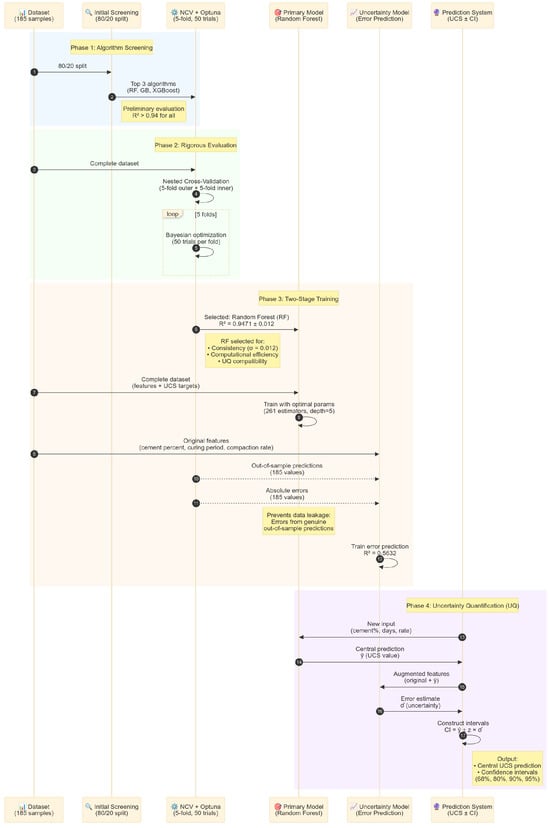 The comprehensive machine learning methodology implemented in this study follows a systematic four-phase approach designed to develop a robust uncertainty quantification (UQ) system for UCS prediction, as illustrated in Figure 3. This workflow begins with initial algorithm screening using a conventional train–test split to identify the most promising approaches, followed by rigorous evaluation through nested cross-validation with Bayesian hyperparameter optimization via Optuna (version 4.3.0). The methodology then transitions to a sophisticated two-stage training architecture where the optimal Random Forest model serves as the primary predictor while a dedicated uncertainty model learns to estimate prediction error magnitudes. This systematic progression from broad algorithm exploration to specialized uncertainty quantification ensures both high predictive accuracy and reliable confidence interval estimation, culminating in a deployed prediction system that provides engineers with both central UCS estimates and calibrated uncertainty bounds for informed decision-making in cement-stabilized soil applications.