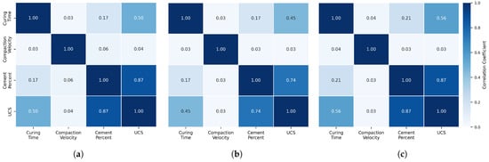 Standard data preprocessing steps were applied as needed for each algorithm, including feature scaling for distance-based and gradient-based methods. The main input features used for modeling were cement content, curing time, and compaction velocity. Other derived or composite features (such as cement/water ratio or porosity/cement ratio) were considered during preliminary testing, but models using the original input variables achieved similar or better predictive performance. As a result, all three primary variables were retained in the final modeling workflow.