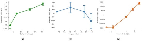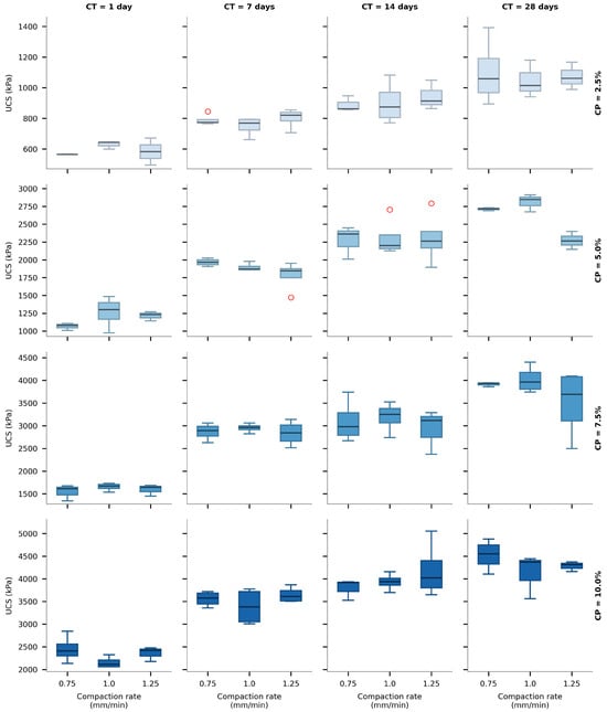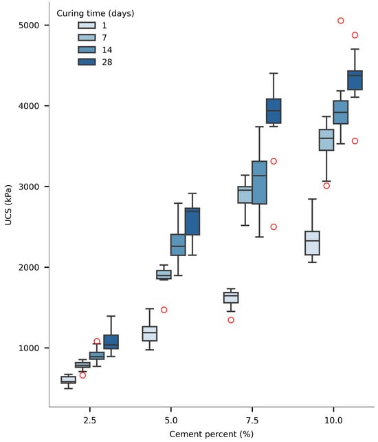 Unconfined compressive strength was chosen as the principal performance indicator for its practical advantages: ease of testing, reproducibility, cost-effectiveness, and its proven relevance in both geotechnical and concrete engineering. The UCS test is uniquely suited for monitoring the strength evolution of cemented soils, especially at higher cement dosages and extended curing periods, where conventional soil tests may become unreliable or insufficient [23,39,45,46].