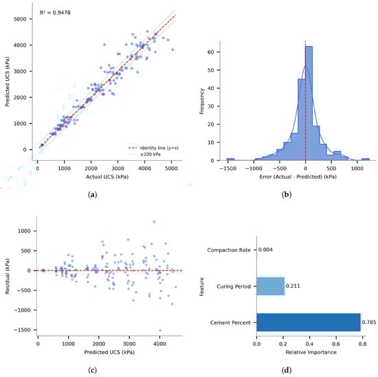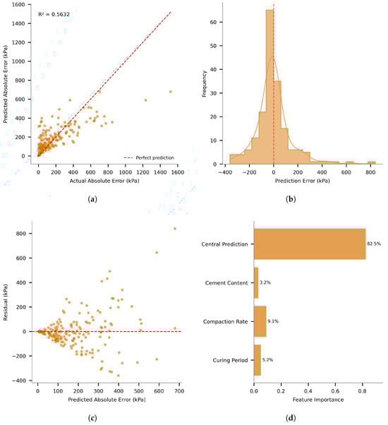 The uncertainty model learns to predict these error magnitudes using an augmented feature set that combines the original input variables (cement content, curing period, compaction rate) with the primary model’s predictions. This feature augmentation enables the uncertainty model to capture heteroscedastic patterns—the observation that prediction uncertainty often varies with prediction magnitude—commonly encountered in geotechnical datasets where higher strength values may exhibit greater absolute variability.