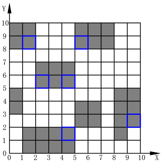 To prevent the selection of deadlock grids as island grids, it is essential to assess the status of the four adjacent grids surrounding each free grid. As illustrated in Figure 4, if two of these adjacent grids are classified as obstacle grids, the free grid is at risk of causing a deadlock. Consequently, it is transformed into an obstacle grid, represented by the number one, as specified in Equation (12). This preprocessing step converts the potential deadlock grids into obstacles, resulting in the creation known as the auxiliary map. For example, after preprocessing the grid map, as shown in Figure 1, the resulting auxiliary map, as depicted in Figure 5, highlights newly added obstacle grids, with black grids framed by blue borders.