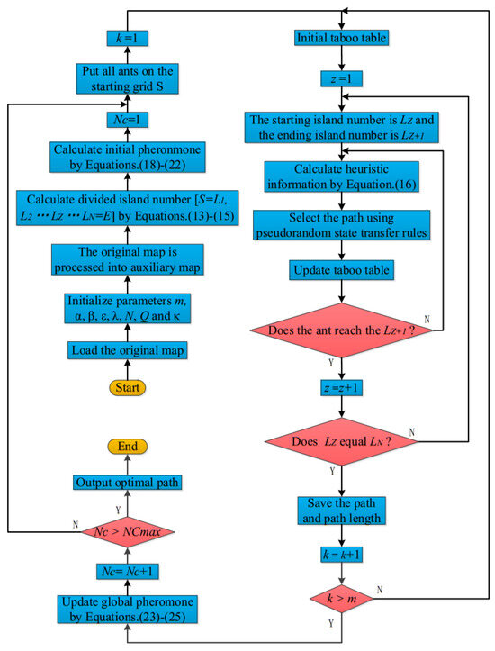 Step 4 Path selection: First, the beginning position S is designated as the first island, while the ending point E is set as the Nth island. The sequence of all islands can be represented as . Additionally, the number of deadlock ants is initialized to 0. In addition, the ant is initially placed on the first island. Using Equations (8), (16), and (17), the next grid j is calculated. Once the ant passes through the grid j, it is added to the taboo list, and this process is repeated. If the ant successfully reaches the next island, that island becomes the new starting position, and the path planning continues, passing through the intermediate islands in sequence until the target point is reached. The complete path formed by connecting all the nodes—which the ant has passed through—is the path discovered by the ant. If the ant has a deadlock between any two adjacent islands, it halts its route search, and the number of lost ants increases by 1. Finally, another ant is placed at the first island to begin path planning from grids S to E, following the same process as the previous ant. The iterative cycle continues until all ants have completed their path planning.