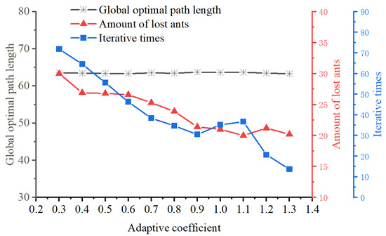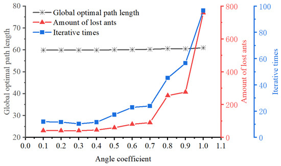 From Figure 11, as the angle coefficient increases, the optimal path length changes very slightly, but both the number of lost ants and iterations increase gradually. When the parameters are set to , the EACI algorithm demonstrates good performance in all the three aspects mentioned above.