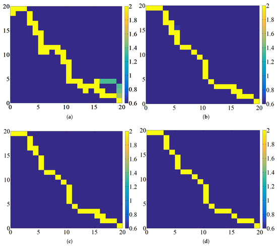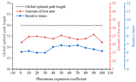 By analyzing Figure 12, it can be observed that, regardless of the pheromone expansion coefficient , the EACI algorithm showed minimal variations in the optimal route, iterative times, and the quantity of deadlock ants. This observation suggests that does not significantly affect the path planning performance of the EACI algorithm.