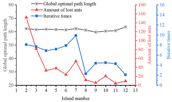 By analyzing Figure 13, it is clear that the optimal route path length remains relatively stable as the number of islands increases, while iterative times and deadlock ants gradually decrease, with iterative times fluctuating between 1 and 10. Additionally, the figure shows that adding more islands does not necessarily improve performance; beyond a certain point, the algorithm’s efficiency no longer improves. In this experiment, the EACI demonstrated good performance when .