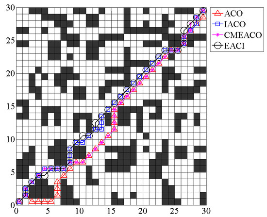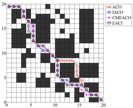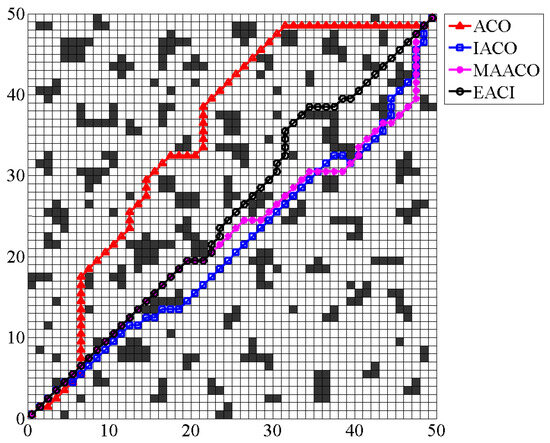 In the 50 × 50 grid environment, the shortest path generated by EACI was 72.8112, outperforming IACO (74.8112) and MAACO (74.5685). The path length obtained by ACO was 81.5980, which was 8.7868 longer than that of EACI. The standard deviation of EACI’s optimal paths in this setting was 0.2707 (0.2707 < 0.3813 < 0.7122 < 2.5233), again lower than the other algorithms, indicating better stability. Regarding average iteration times, EACI required only 7.1 iterations, representing a reduction of 59.66% and 74% compared to MAACO and IACO, respectively. The average number of lost ants for EACI was 99.2, which was 295.2, 780, and 3889.5 fewer than those of MAACO, IACO, and ACO, respectively. Although EACI did not exhibit a significant advantage in the total number of path total corner angle compared to the other algorithms, it still stood out in terms of overall performance.