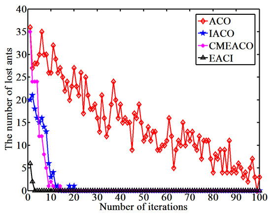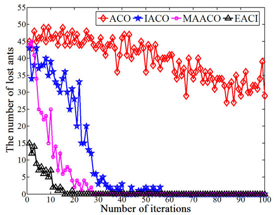 Number of lost ants generated by the four algorithms in the 40 × 40 grid environment.