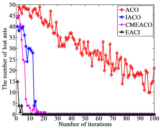 Number of lost ants generated by the four algorithms in the 50 × 50 grid environment.