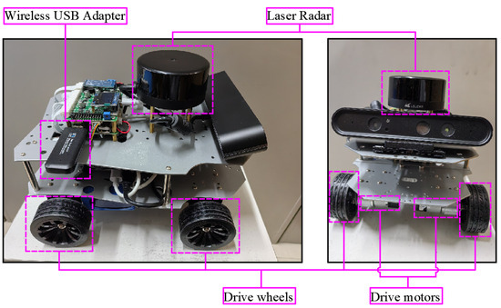 To validate the effectiveness of the EACI algorithm in a real-world environment, an experimental platform was constructed consisting of a Mini ROS vehicle (which produced by WHEELTEC Co., Ltd. of China in Dongguan) and a personal computer. As shown in Figure 31, the mini vehicle, measuring 265 mm × 205 mm × 195 mm, served as host computer, while the personal computer acted as the client computer. Both the host and the client were equipped with the 64-bit Ubuntu 18.04 operating system and the Robot Operating System (ROS), Melodic. Communication between the two was established via a Wi-Fi network using the SSH protocol, enabling remote control of the mini ROS vehicle through its IP address.